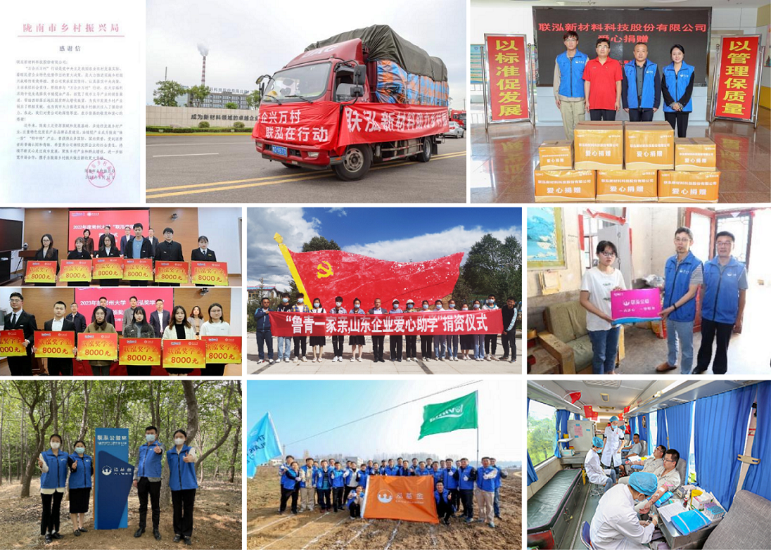 在創(chuàng)造效益、解決就業(yè)、貢獻(xiàn)稅收的基礎(chǔ)上,公司持續(xù)懷抱感恩之心踐行公益,回饋社會(huì),為構(gòu)建更加美好的社會(huì)持續(xù)注入力量。公司積極響應(yīng)國(guó)家號(hào)召,主動(dòng)對(duì)接國(guó)家鄉(xiāng)村振興重點(diǎn)幫扶縣,開(kāi)展農(nóng)產(chǎn)品消費(fèi)幫扶,為鄉(xiāng)村振興貢獻(xiàn)力量;捐資設(shè)立常州大學(xué)“聯(lián)泓獎(jiǎng)學(xué)金”,赴青海省海北州開(kāi)展助學(xué)活動(dòng),資助滕州市木石鎮(zhèn)優(yōu)秀學(xué)子,激勵(lì)和幫助在校學(xué)生勤奮學(xué)習(xí)、全面發(fā)展;設(shè)立公司內(nèi)部公益組織“泓基金”,組建志愿者團(tuán)隊(duì),定期向棗莊市兒童福利院捐贈(zèng)愛(ài)心物資幫扶孤殘兒童,與大眾網(wǎng)合作舉辦“七彩童心 綠動(dòng)未來(lái)”聯(lián)泓杯山東省兒童環(huán)保繪畫(huà)大賽。公司號(hào)召員工積極參與公益活動(dòng),組織員工志愿者無(wú)償獻(xiàn)血,赴微山湖紅河濕地牡丹園、滕州墨子濕地等開(kāi)展公益種植活動(dòng),建設(shè)“聯(lián)泓公益林”。